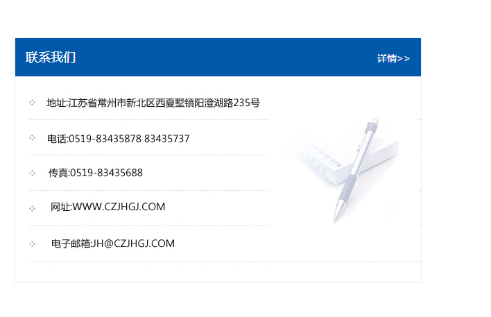 地址:常州市新北區友邦商務大廈1幢16、17層  電話:0519-85101652  傳真:0519-85112595  郵編:213022  網址:www_cz-jiayue_cn.zz-nb.com  郵箱:xiajifengaa@163.com